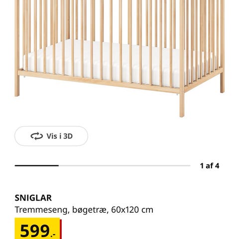 IKEA SNIGLAR tremmeseng i bøg, størrelse 60x120 cm. Klassisk tremmeseng med åbne tremmer på alle sider, som giver god ventilation omkring barnet. Sengen er udført i lyst træ og har en enkel, funktionel udformning, der passer ind i de fleste børneværelser. Egnet til spædbørn og småbørn inden for standard tremmesengsmål 60x120 cm.