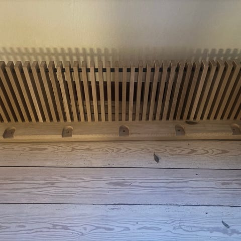Skagerak væghængt knagerække i egetræ med integreret bøjlestang i metal. Knagerækken har en åben lamelkonstruktion øverst, der kan bruges som lille hylde til opbevaring, samt en nedhængt metalstang til bøjler. Velegnet til entré eller garderobe til ophæng af jakker og frakker.