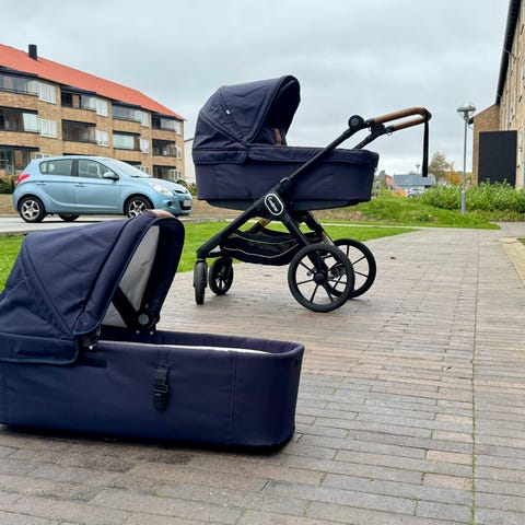 Funktioner: punkterfrie drejehjul, fodbremse, justerbar termobase, udluftning i kaleche og indbygget myggenet og solsejl. Ryggen kan løftes op så baby (fra 7 mdrs alderen) kan sidde.