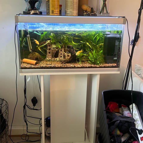 Akvarium med LED-lys i hvid ramme. Akvariet har en rund front og er beregnet til indendørs brug. Det står frit på bord eller hylde og tilsluttes med strømledning. Der er indbygget belysning i toppen, som lyser ned i akvariet. Egnet til mindre fisk eller som dekorativt akvarium med planter og dekorationer.
