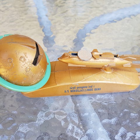 En anderledes brevpresser fra 1980 i massiv, gennemsigtig akryl. Indeni kuben er miniaturekopier af danske statsobligationer, det danske flag og våbenskjold. Fremstillet af Morgan Stanley International. 7,9 x 6,( x 6,4 cm. Lidt ridser under bunden og lidt slid.