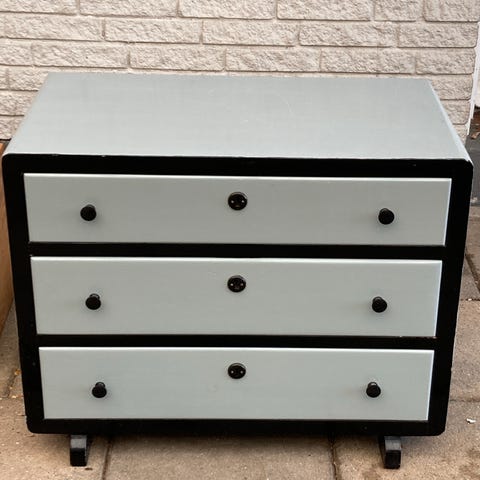 Fineste lille kommode med sider, top og skuffefronter i rød linoleum.