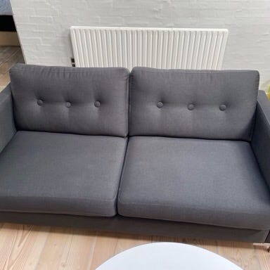 Sofaen har et enkelt og moderne design med buede kanter. Den er polstret med et lyst, tætvævet stof. Høj ryg og dybe sæder giver komfort.