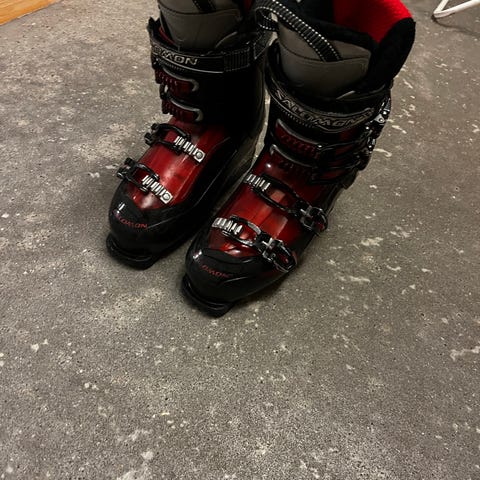 Salomon skistøvler i sort. Modellen har fire justerbare spænder på hver støvle samt rem øverst for ekstra fastspænding.
