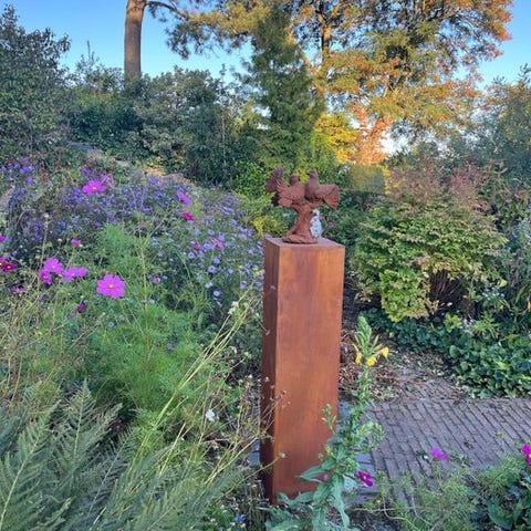 Et smukt par statuer af to engle, den ene med en fugl i hånden, den anden en lille fugl på benet. De viser et smukt detaljeret billede. Flot forvitrede, klassiske stykker med rustpatina. Målene er som følger, pr. stykke (+/-):