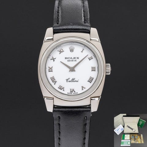 Rolex Cellini 'Pre-Midas' reference 4014, en 18K hvidguld håndoptrukket dresswatch fra omkring 1977, kasse 28 mm og blå skive. Klik på den blå "gå til varen" knap, for at købe eller byde på denne vare. Den samlede pris vil blive vist inden du afgiver dit bud.