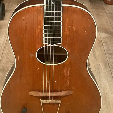 Ingen brud- eller revner og reparationer, men synligt slid, mange mærker og små buler over hele guitaren.