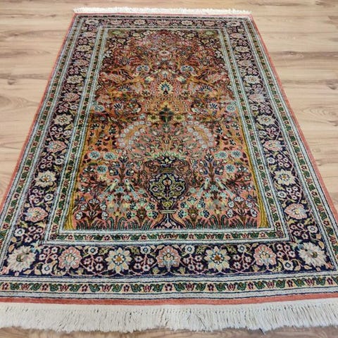 Oprindelse Indien, model Ghoum; håndvævet tæppe 160 x 93 cm af silke på bomuld, med certifikat af kvalitet og oprindelse, i meget god stand. Klik på den blå "gå til varen" knap, for at købe eller byde på denne vare. Den samlede pris vil blive vist inden du afgiver dit bud.