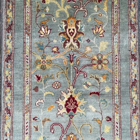 Dette er et håndknyttet østligt tæppe, lavet af holdbare, naturlige materialer. Måden det er vævet på, og mangfoldigheden i mønstrene gør dette tæppe til et unikum og understreger det autentiske og håndværksmæssige karakter.