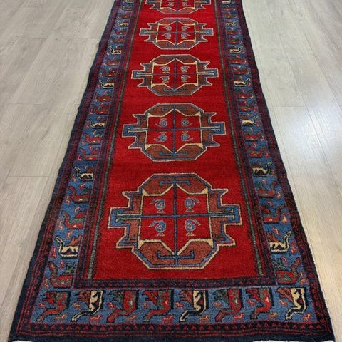 Til salg står et ægte håndknyttet orientalsk tæppe i traditionelt Belouch-design. Det fint strukturerede felt viser en tæt række af små rektangulære motiver i forskellige farver, som giver tæppet en livlig, samtidig afbalanceret virkning. Den øverste afslutning er udformet som en stiliseret bønnisje, hvilket giver tæppet en tydelig lodret orientering.