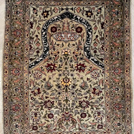 Håndknyttet tyrkisk Hereke-silketæppe med klassisk medaillon- og floralt ornamentmotiv. Tæppet er lavet af 100 % ren silke og kendetegnes ved en meget fin, detaljeret knytning. Den typiske silke-glans med skiftende farveeffekt afhængigt af lysets indfald.