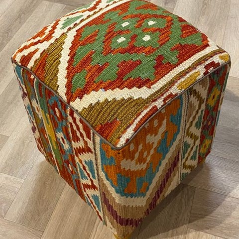 Oprindelse Afghanistan, Model Poef - ( unused ) - håndvundet kelim - ubrugt - uld - farverig kelim - ny; Dimensioner 45 cm x 45 cm; materiale uld og træ; tilstand: i særdeles god stand. Klik på den blå "gå til varen" knap, for at købe eller byde på denne vare. Den samlede pris vil blive vist inden du afgiver dit bud.