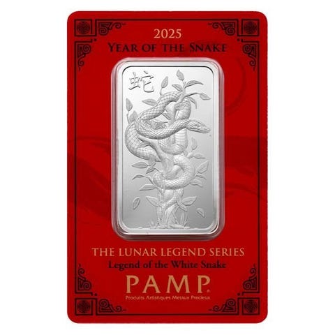 2025 1 oz Asahi Lunar Snake Silver Bar er et bemærkelsesværdigt stykke i Asahi Refinings Lunar-serie, der fejrer Slangeåret. Fremstillet af 1 troy ounce af .999 fin sølv, har denne bar et smukt detaljeret slangedesign, der fanger essensen af visdom, modstandskraft og forandring, som er forbundet med Lunar Snake. Hver bar afspejler Asahis engagement i kvalitet og kunsthåndværk, hvilket gør den til et ideelt valg for samlere og sølvinvestorer.