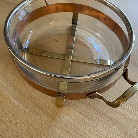 Glas, Skål med messing holder, Nilsjohan, Ovnfast glasskål med kobber og messing stativ fra Nilsjohan Sweden. 15,3 cm høj og 26 x 19,5 cm.