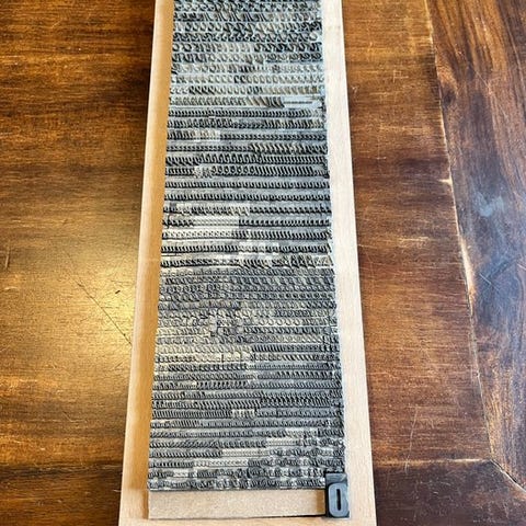 Antik eg-brevskuffe (galley) fyldt med art nouveau trykbogstaver i pæretræ, tal og tegnsætning