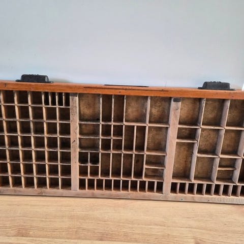 Antik brevskuffe i egetræ fyldt med pæretræ trykkbogstaver, tal og tegnsætning fra 1850–1900, i god brugt stand med mindre tegn på alder og pletter, mål 40 × 26 × 3 cm, oprindelse Frankrig. Klik på den blå "gå til varen" knap, for at købe eller byde på denne vare. Den samlede pris vil blive vist inden du afgiver dit bud.