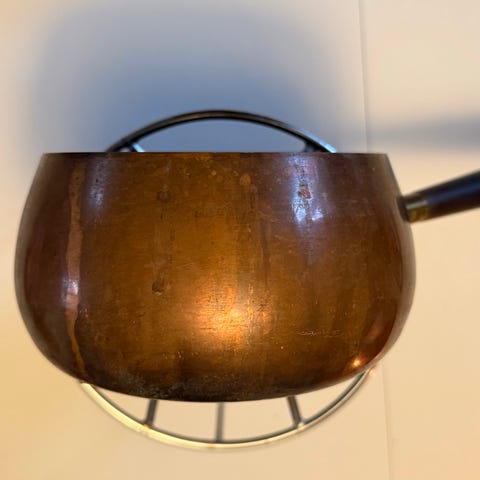 Du kan naturligvis købe nye kobberfonduegryder, men de er oftest udstyret med en spiritusbrænder. Den meget sikrere mulighed er naturligvis denne elektriske variant. Desværre bliver dette specifikke eksemplar ikke længere produceret.