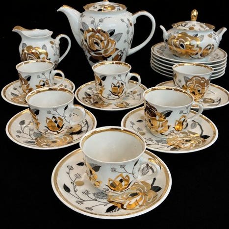 Elegant porcelænsservice – Chodzież, Polen – blomsterdekoration med guldrand – det 20. århundrede