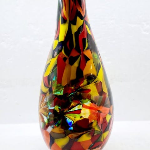 Ekstra stor!, begrænset og øjenfangende vase håndlavet af designer og mester glasblæser A. Ballarin i Murano (Venedig). Denne nye og smukke vase er i begrænset oplag skræddersyet og leveres med autenticitetskort og er håndsigneret af mester Ballarin selv. Vasen er udført i et strålende komplementært farvekontrast.
