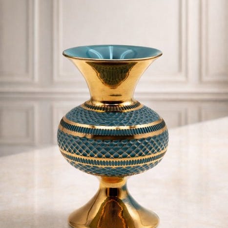 Elegant dekorativ vase inspireret af Capodimonte-traditionen, udført i en rig, Imari-inspireret farvepalet. Overfladen er smukt hånddekoreret med fugle og blomster motiver, arrangeret i afbalancerede ornamentale paneler, fremhævet af en varm, raffineret forgyldning.