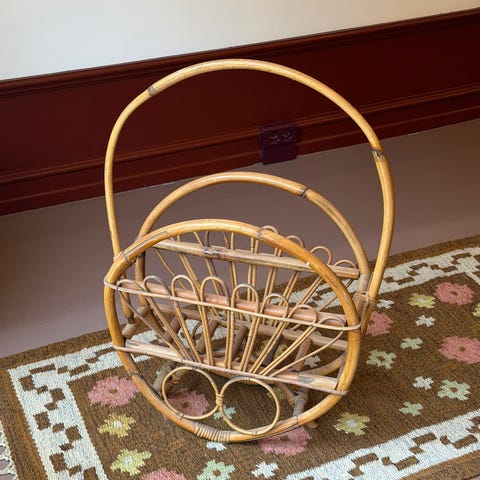 Large vintage rattan magazine holder, Italy 1960’s Good vintage condition. Has traces of use and age, but the rattan is intact everywhere. H50 x W45 x D30 cm