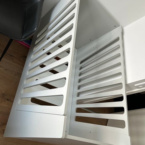 Siden kan tages af, så den kan bruges som sofa, eller en åben seng når barnet bliver ældre.