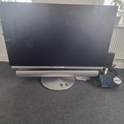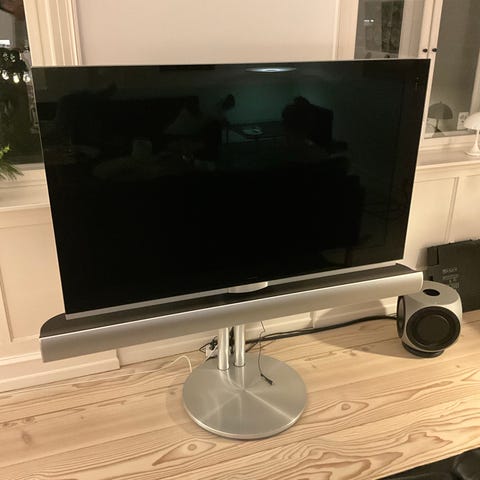 Fladskærms-tv med sort front og bagpanel med integreret højtalerområde. Tv’et hentes med tilhørende metalbeslag, som kan bruges til montering. Velegnet som central skærm i stue, hvor der ønskes Bang & Olufsen billed- og lydløsning.