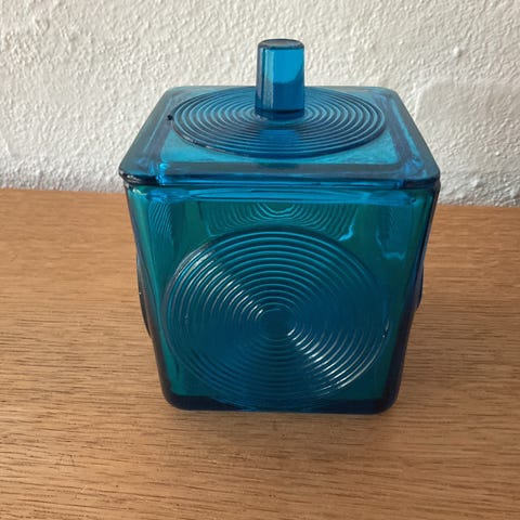 Blå glas lågkrukke fra Holmegaard, Skjold, 8 cm i højde og 8 cm diameter, uden skår, skader eller afslag.