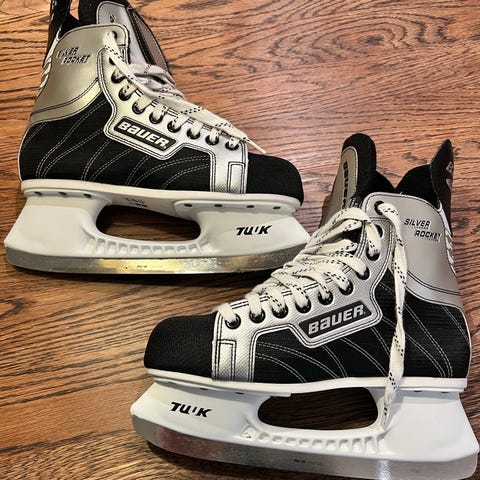 Bauer Performance ishockey skøjter i størrelse 42. Klassiske sorte skøjter med hvid sål og klinge. Overdel i syntetisk materiale med snørelukning og polstret pløs for støtte omkring anklen. Egnet til ishockey og generel brug på isbaner.