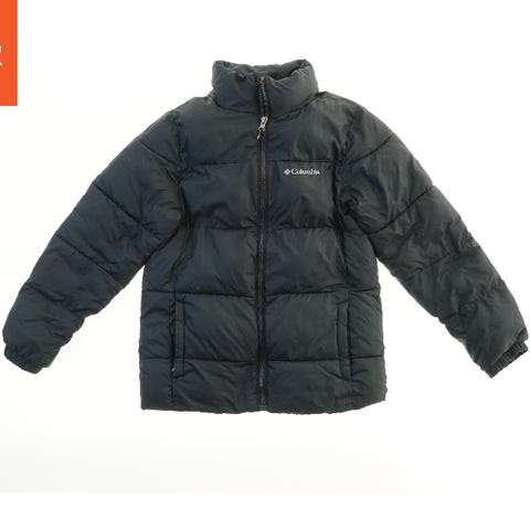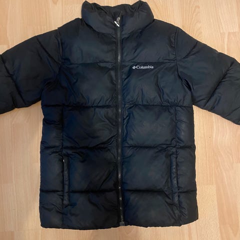 Jakke med høj krave og lynlås. Den har to sidelommer og en elastisk kant ved håndleddene. Der er et synligt logo på forsiden.