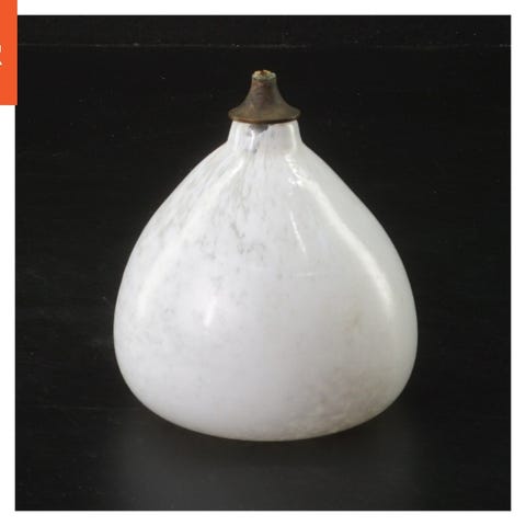 Denne dekorative olielampe er lavet af hvid keramik og har en rokoko-stil med blomsterdekoration. Lampen har en messingmontering i midten og er i stand til at holde olie til belysning. Den er 19 cm høj.
