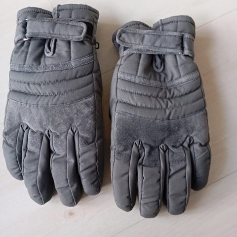 Et par sorte handsker designet til vinterbrug, ideelle til skiløb. Handskerne har en trefingers konstruktion for bedre greb og varme. De er udstyret med elastiske manchetter og har et refleksivt design for ekstra synlighed. Mærket 'Thinsulate' ses på etiketten, hvilket indikerer isolering for varme. Størrelsen er 26,5 cm.