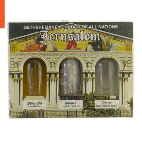 Et sæt bestående af tre små flasker indeholdende olivenolie fra Galilæa, sten fra Jerusalem, og vand fra Jordanfloden. Produktet kommer fra Jerusalem og er mærket med 'Gethsemane - Church of All Nations'. Forsiden af æsken viser et billede af kirken. Bagsiden indeholder en beskrivelse af Gethsemane og autenticiteten af produkterne.