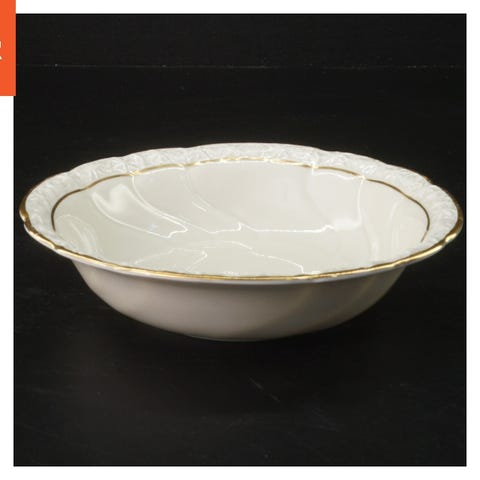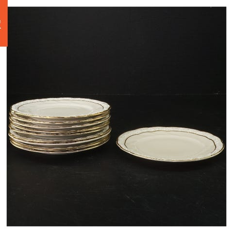 Sættet består af en lille vase og fire mindre tallerkener. Alle dele er fremstillet af porcelæn og har fine guldkantdetaljer. De har følgende mål: Ø 6,5 x h 7 cm, ø 4 x h 6 cm og ø 8 cm.