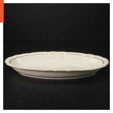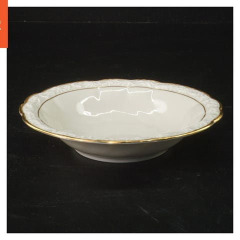 Porcelænsskål med en diameter på 18 cm. Den har en elegant guldkant og et indgraveret mønster rundt langs kanten. Bunden af skålen har en stempelmarkering.