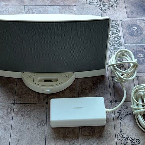 Bose SoundDock højttaler i hvid. Dockingstation til ældre iPod/iPhone-modeller med 30-pin stik. Front med integreret højttaler gitter og betjeningsknapper til lydstyrke. Leveres med strømforsyning til nettilslutning. Velegnet som kompakt lydløsning i hjemmet til afspilning af musik fra kompatible Apple-enheder.