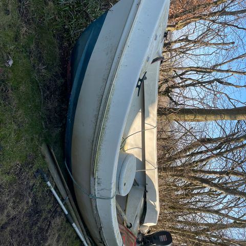 Grå Pionerjolle 10 fod sælges. Har været brugt som hækjolle. Der er monteret en lænseprop.