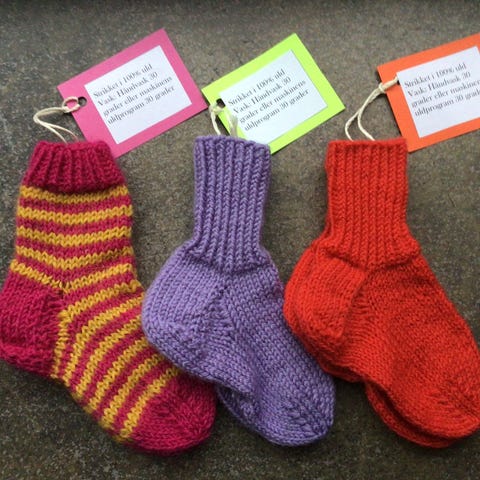 Lækre ren uld baby-sokker, strikket med kærlighed for håndværket, af min mor i røgfrit hjem. De måler 9cm. fra hæl til tå.