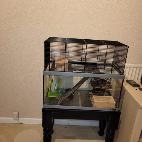 Sælger dette store fine hamster bur. Buret er brugt men standen er flot. Kan også bruges som fugle bur. Målende er