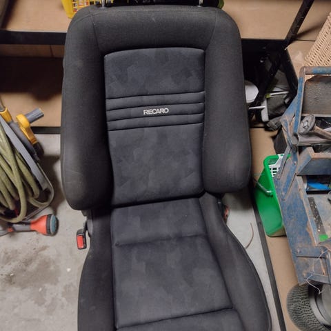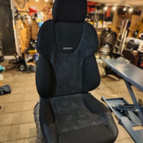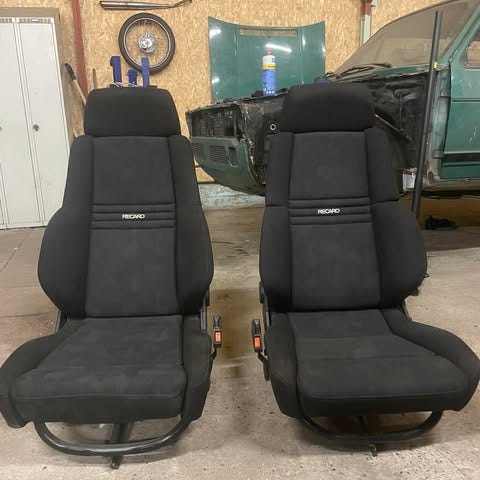 Ægte Recaro el bilsæder i sort stof. Sættet består af to forsæder med integrerede nakkestøtter. Sæderne har markante sidestøtter og polstring, som giver støtte omkring ryg og lår. Undersiden viser mekaniske og elektriske komponenter, som kan indikere justerings- eller komfortfunktioner afhængigt af bilens installation.