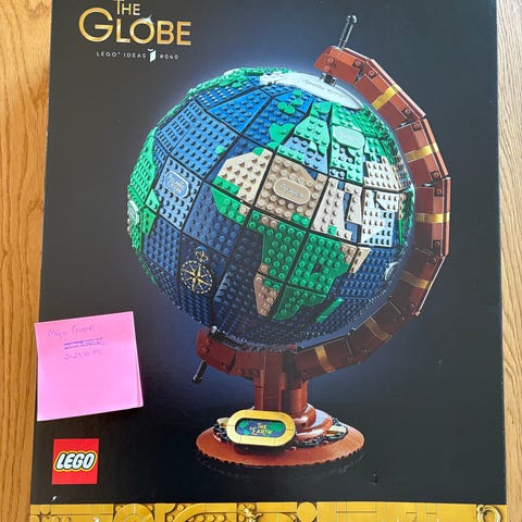 LEGO Icons The Globe byggesæt. Sættet forestiller en klassisk globus opbygget af LEGO klodser med kontinenter, oceaner og kompasdetaljer samt en base med navneskilt. Egnet som udstillingsmodel og til LEGO-samlere og -entusiaster.