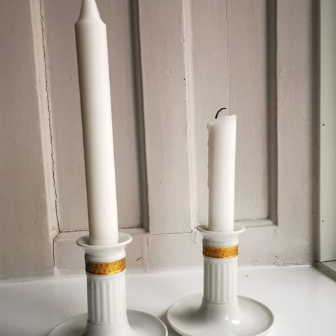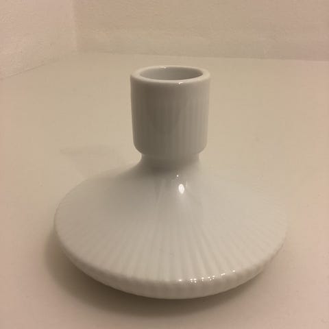 Royal Copenhagen Hvid Riflet lysestager i porcelæn. Sæt med to lysestager i hvidt porcelæn med riflet dekoration og rund fod. Velegnet til almindelige kronelys. Leveres med originale æsker, som ses på billederne.