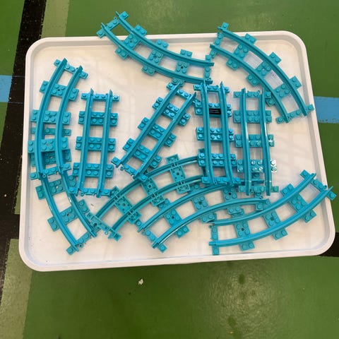 Denne genstand er en trætogbane pakket i en gennemsigtig plastkasse. Sættet inkluderer flere dele af togbanen, herunder skinner, bygninger og farverige figurer. En farverig legetæppe med togbanemotiv er også inkluderet. Banen er primært lavet af træ med nogle plast og malede komponenter. Kassen måler 40,5x26 cm og er ideel til opbevaring og transport til leg eller organisering.