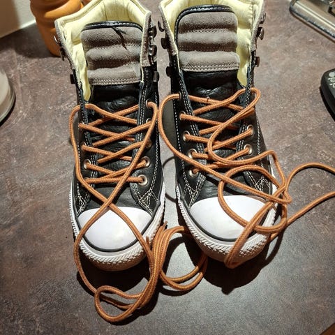 Dette er et par grå Converse All Star sneakers med høj top. Skoene har hvide snørebånd og en hvid gummisål med sorte striber. De er lavet af tekstilmateriale og har Converse All Star-logoet på bagsiden. Skoenes længde er 33 cm.