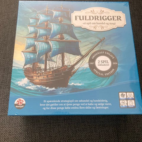 Brætspillet 'Fuldigger' er et strategispil om søhandel og handelskrig. Spillet inkluderer en spilleplade, brikker, pengesedler, kort og instruktioner. Det er designet til 2-4 deltagere, og anbefales til aldersgruppen 7 år og opefter. Emballagen viser et farverigt billede af et skib og et kort over verdenen med forskellige handelsruter.