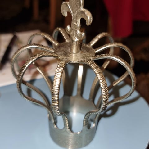 En dekorativ krone lavet af metal med snoede stænger. Den har en diameter på 6 cm og kan anvendes som en dekorativ genstand. Kronen har en metalfinish, som giver den en elegant udseende. Tags: krone, dekoration, metal
