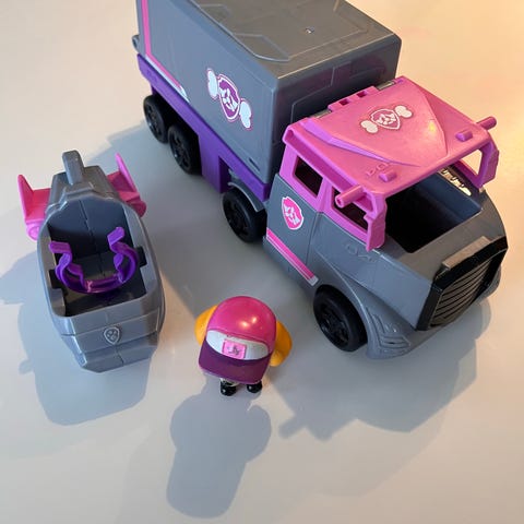 Dette sæt består af en figur af Skye fra den populære børneserie Paw Patrol og hendes unikke flyvende køretøj. Køretøjet er overvejende lilla med grå detaljer og har bevægelige dele. Figuren af Skye kan sidde i cockpittet på køretøjet. Målene er 15x15x8 cm.