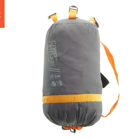 En sort og orange sovepose fra mærket Camp Out. Den er kompakt og kan bære størrelse 165x70x45 cm. Soveposen er pakket i en praktisk transporttaske med grå stropper og snørelukning. Velegnet til camping og friluftsliv.