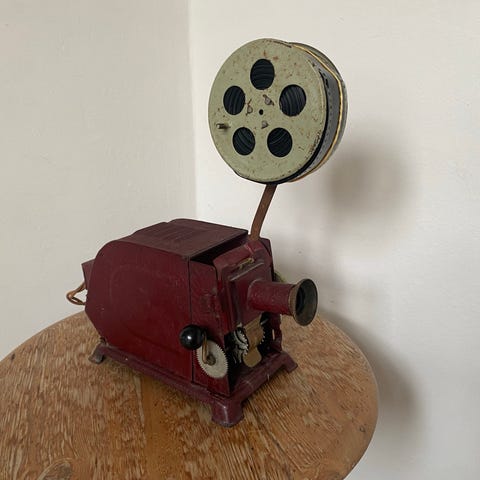 Gammel filmapparat, fremviser til 35 mm, virker. Måske hedder den Junior D Kino, men det står ikke på den.