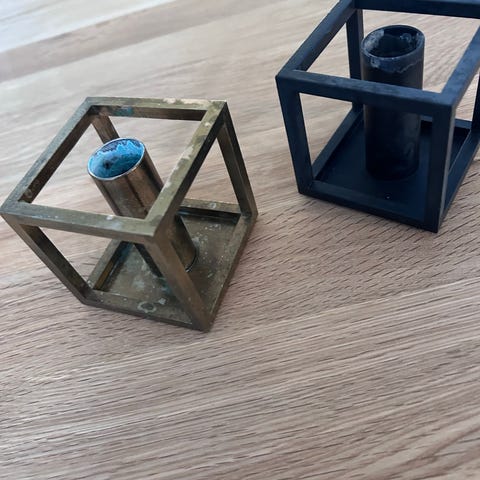 Audo Copenhagen lysestage i metal. Lysestagen har et kubisk stel med fire rørformede holdere til lys. Velegnet som borddekoration eller til placering på hylde eller vindueskarm i hjemmet.